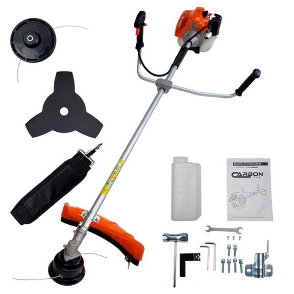 Roçadeira marca – Motor semelhante ao da sthilRobusta e com estrutura resistenteEquipada com empunhadura emborracha que proporciona conforto na operaçãoConjunto de fixação do guidão e de fácil ajuste pelo operadorSistema de arranque com redução de impacto proporcionar menor esforço na hora do arranque e maior vida útil do sistemaEquipada com um motor 2 tempos à gasolinaPossui uma proteção única para a faca de corte e para o carretel, que possui um limitador de fio de nylonGarante uma manutenção fácil e rápida Indicada para trabalhos profissionais de maior intensidadeIdeal para limpeza de áreas com vegetação densa e alta, como sítios e fazendasPode ser acoplada com enxada rotativaAcessórios inclusos: Carretel de nylonLâmina 3 pontasCinto de suporte Kit de ferramentasEspecificações Técnicas: Tipo transmissão: Embreagem automática centrifuga, eixo rígidoRelação de redução: 16: 19Rotação das lâminas de corte: Sentido anti-horário visto pelo operadorCapacidade do depósito de combustível: 1,1 LitrosMotor: Tipo: 1E40F-5DVolume de deslocamento de ar: 58 CCPotência máxima: 2,238 kw / 9000 rpm – 3HPCarburador: Tipo diafragmaMétodo ignição: TCIMétodo de arranque: RecoilLubrificante: Óleo para motores de 2 temposCombustível: Gasolina mistura com óleo lubrificante relação de mistura 25:1